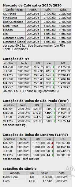 Na ICE Futures US, os contratos de arábica para maio próximo, oscilaram, sexta-feira (20), 1.500 pontos entre a máxima e a mínima, batendo, na máxima do dia, em US$ 3,1240 por libra peso, em alta de 1.150 pontos. Encerraram o dia hoje valendo US$ 3,0975por libra peso, em alta de 885 pontos (2,94%). Na ICE Europe, os contratos de robusta para maio próximo, bateram, sexta-feira (20), na máxima do dia em 3.706 dólares por tonelada, em alta 37 dólares. Fecharam o pregão a 3.664 dólares, em queda de 5 dólares (2,52%).