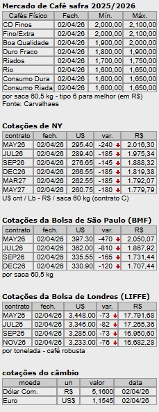 Nesta quinta-feira (2), véspera do feriado de “Sexta-Feira Santa”, os contratos de arábica em Nova Iorque e os de robusta em Londres fecharam em queda. Os contratos de arábica para maio próximo na ICE Futures US, oscilaram 925 pontos entre a máxima e a mínima, romperam mais uma vez a barreira dos três dólares, batendo, na máxima do dia, em US$ 3,0150 por libra peso, em alta de 370 pontos. Encerraram o dia valendo US$ 2,9540 por libra peso, em queda de 240 pontos (0,81%). Na ICE Europe, os contratos de robusta para maio próximo, bateram, na máxima do dia, em 3.549 dólares por tonelada, em alta de 28 dólares. Fecharam o pregão a 3.448 dólares, em queda de 73 dólares (2,07%).