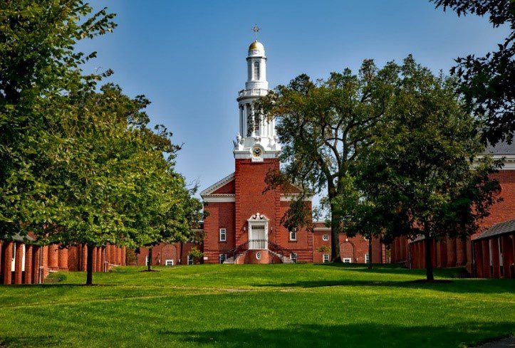 O jardim da Escola em New Haven, CT, USA, com a Capela ao fundo.