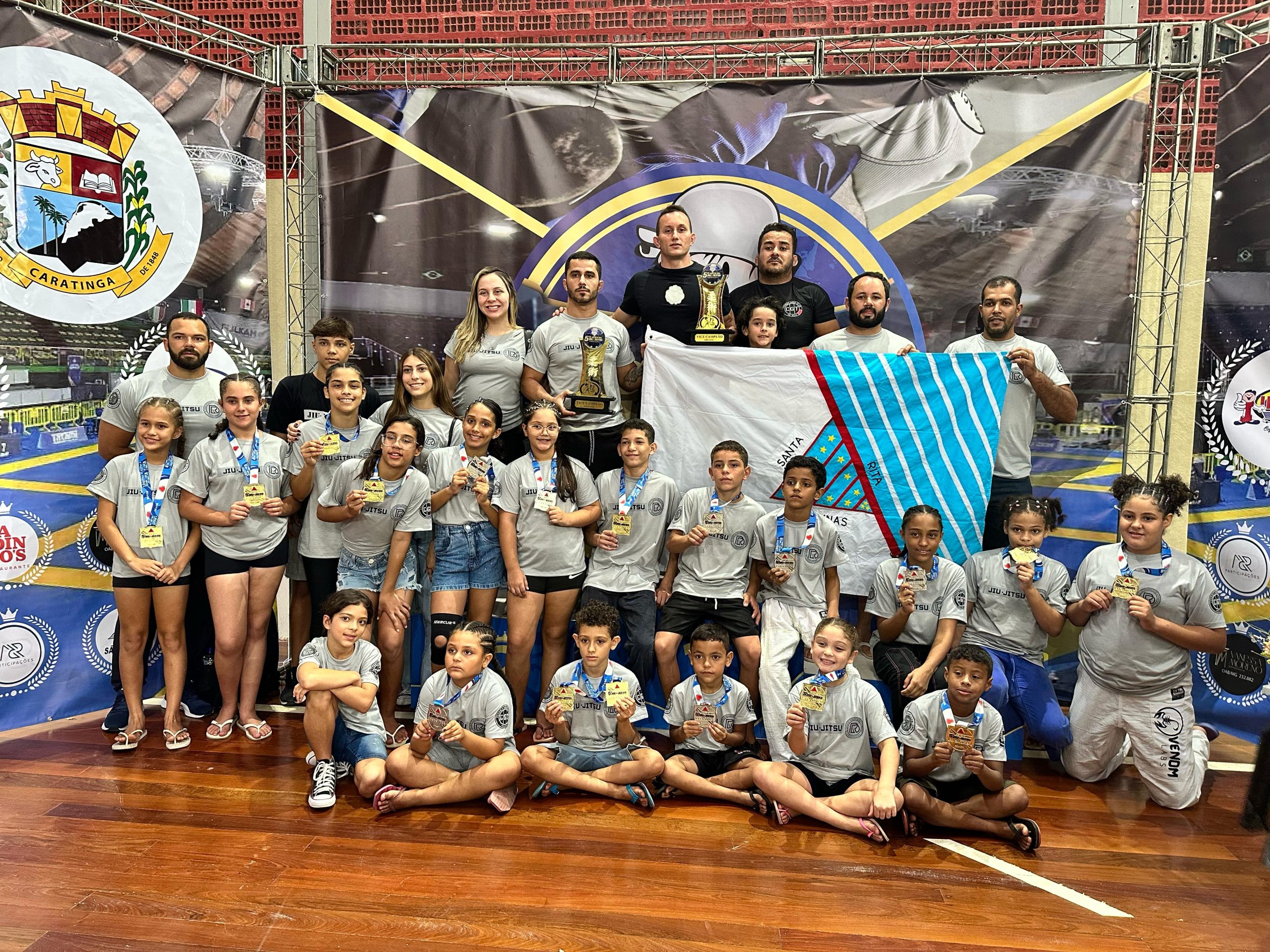 CARATINGA – No último domingo (16), os alunos do RD Centro de Treinamento, projeto social liderado pelos professores Rodrigo Ribeiro e Eduarda Lanes na cidade de Santa Rita de Minas, se destacaram no 5° Aberto de Jiu-jitsu em Caratinga, conquistando 25 medalhas. A competição contou com mais de 300 atletas de todo o estado e equipes de diversas regiões, e mesmo em meio a tantos competidores, o desempenho brilhante dos atletas do Projeto Social RD juntamente a equipe CGT fez com que a quantidade de pontos somadas fossem o suficiente para levarem o título de Vice Campeões Geral por equipes e Vice Campeões Infantil.