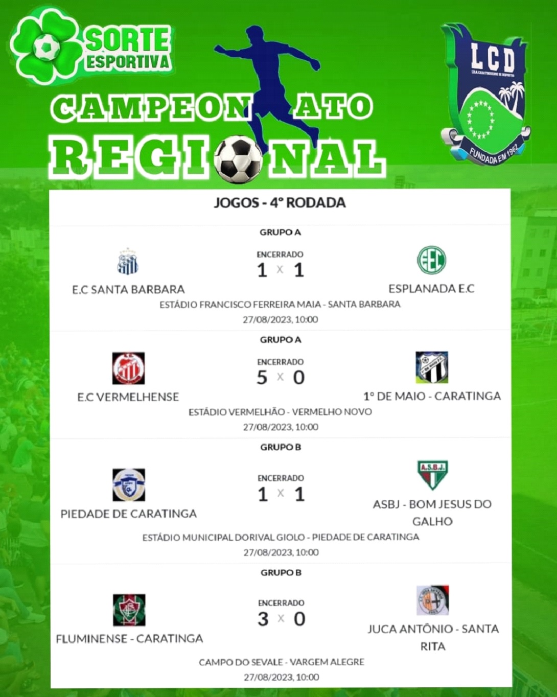 SANTA BÁRBARA DO LESTE – A manhã de domingo (27) com céu carrancudo e dia chuvoso não é típico dessa época do ano. Mas, talvez fosse um prenúncio que teríamos uma chuva de gols também na abertura do returno do Campeonato Regional da LCD. Foram 12 gols em quatro jogos pelo certame.