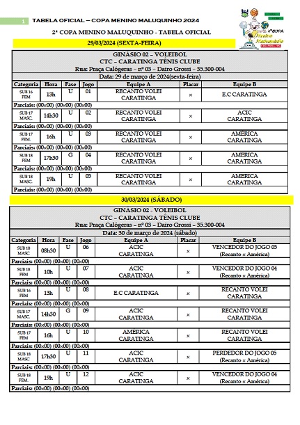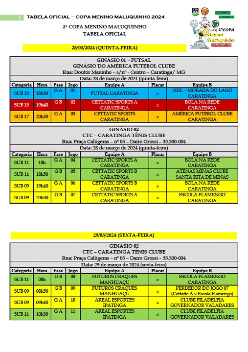 CARATINGA- Acabou a espera, esta semana começa a 2° edição da Copa Menino Maluquinho. A competição, que foi um enorme sucesso ano passado, era aguardada ansiosamente por atletas, professores e técnicos de Caratinga e diversas cidades de diferentes regiões. 14 delegações, nove cidades, mais de 400 atletas de 09 a 17 anos, serão 32 equipes em ação nas modalidades futsal e voleibol, disputando a competição nos dias 28, 29, 30 e 31 deste mês.