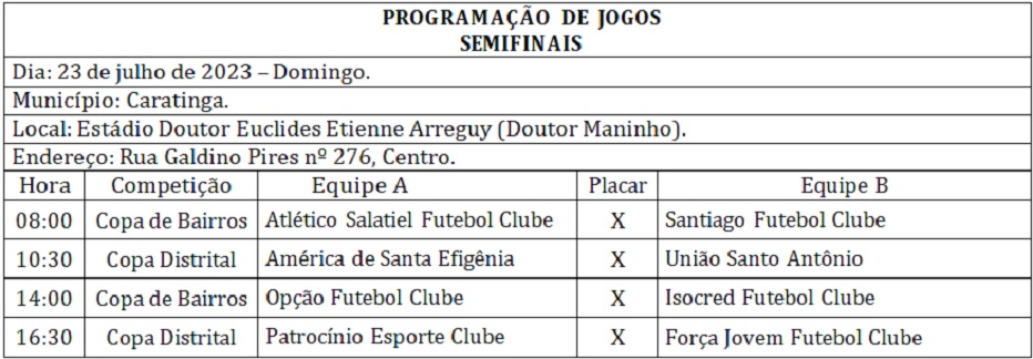 No domingo (23), no Estádio Doutor Maninho, enfrentam-se pela fase semifinal, às 8h – Atlético Salatiel e Santiago Futebol Clube pela Copa de Bairros e às 10h30– América de Santa Efigênia e União Santo Antônio pela Copa Distrital. Às 14h – Opção Futebol Clube e Isocred Futebol Clube pela Copa de Bairros e às 16h 30– Patrocínio Esporte Clube e Força Jovem de Santa Luzia pela Copa Distrital. Os vencedores das partidas semifinais fazem as finais no domingo (30).