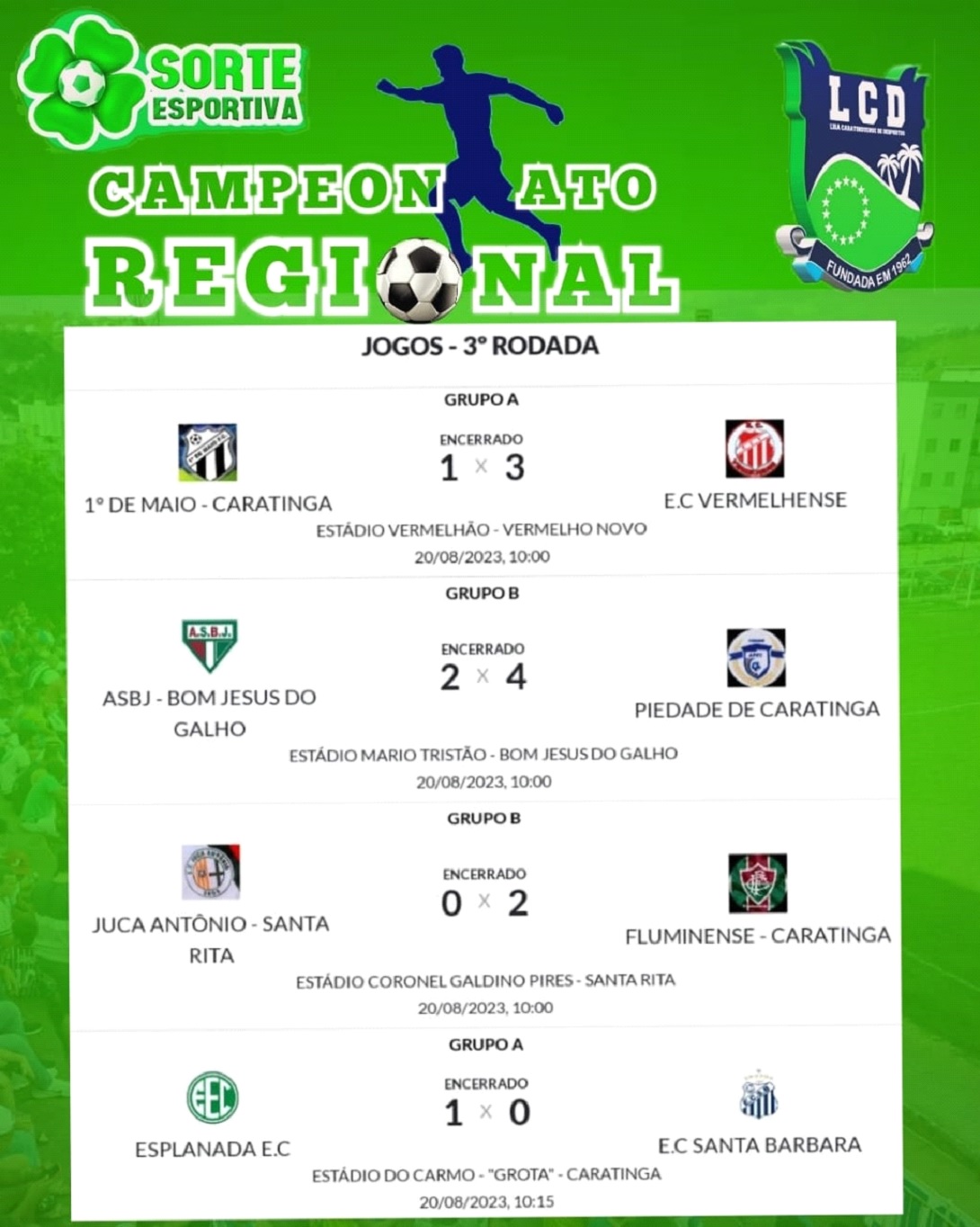 CARATINGA – Depois de um final de semana sem futebol pelo Campeonato Regional, a bola rolou neste domingo (20) pela terceira rodada do certame da Liga Caratinguense de Desportos. Quatro jogos agitaram a torcida em quatro cidades da região.