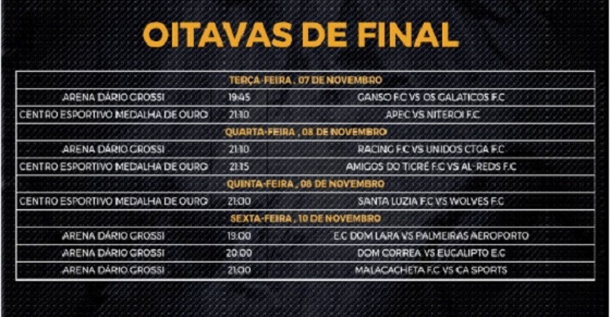 A fase mata-mata começa nesta terça-feira (7) com a partida entre Ganso diante do time Os Galáticos. O jogo acontece a partir das 19h30, na arena Dário Grossi. Logo depois, às 21h10, Apec enfrenta o Niterói no Centro Esportivo Medalha de Ouro.