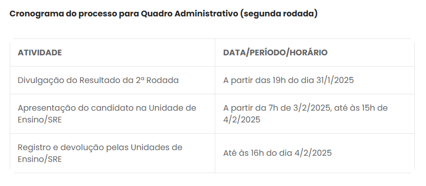 Já a partir da segunda rodada online, as contratações do quadro administrativo também terão alterações no cronograma, conforme quadro abaixo.
