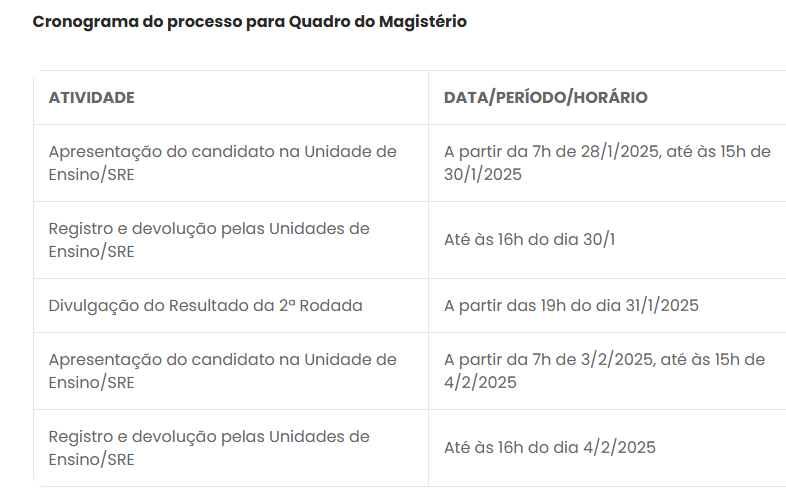 O processo teve início na última sexta-feira (24/1), e os candidatos tiveram até esta segunda-feira (27/1) para comparecer às unidades escolares designadas. Esse processo abrange vagas para diversas funções no quadro administrativo, como: Analista de Educação Básica (AEB), Assistente Social, Fisioterapeuta, Fonoaudiólogo, Psicólogo, Terapeuta Ocupacional, Assistente Técnico de Educação Básica (ATB) e Auxiliar de Serviços de Educação Básica (ASB).