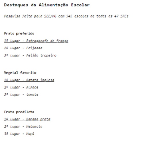 Neste mês, a Secretaria de Estado de Educação de Minas Gerais (SEE/MG) realizou uma pesquisa amostral para saber dos estudantes quais são suas refeições preferidas. Foram ouvidas 545 escolas de todas as 47 Superintendências Regionais de Ensino (SREs) do estado.