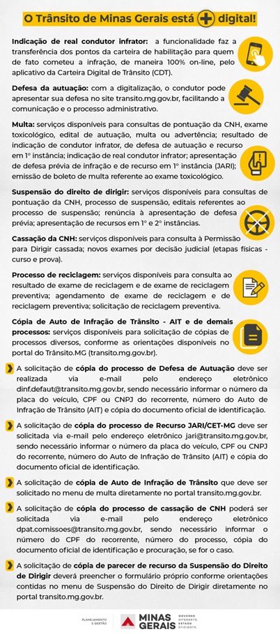 Com a implementação de soluções tecnológicas, 60% dos serviços de trânsito em Minas podem ser feitos on-line atualmente, no site www.transito.mg.gov.br ou em aplicativos como o MG App e a Carteira Digital de Trânsito (CDT). O objetivo é oferecer funcionalidades digitais que priorizem a agilidade, a transparência e a praticidade em todos os processos.