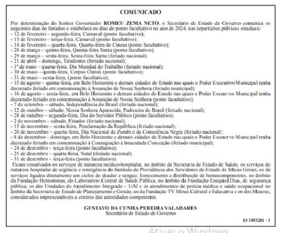 DA REDAÇÃO – O Governo de Minas publicou, nesta quinta-feira (4), no Diário Oficial, um comunicado com os dias de feriado e ponto facultativo para o ano de 2024 nas repartições públicas estaduais. O documento foi assinado pelo secretário de Estado de Governo, Gustavo Valadares.