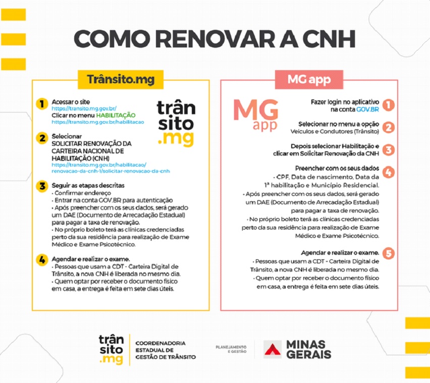 O pedido de renovação pode ser feito no site da Coordenadoria Estadual de Gestão de Trânsito (CET-MG), da Secretaria de Estado de Planejamento e Gestão (Seplag-MG), ou pelo aplicativo oficial do Governo de Minas – MG App.