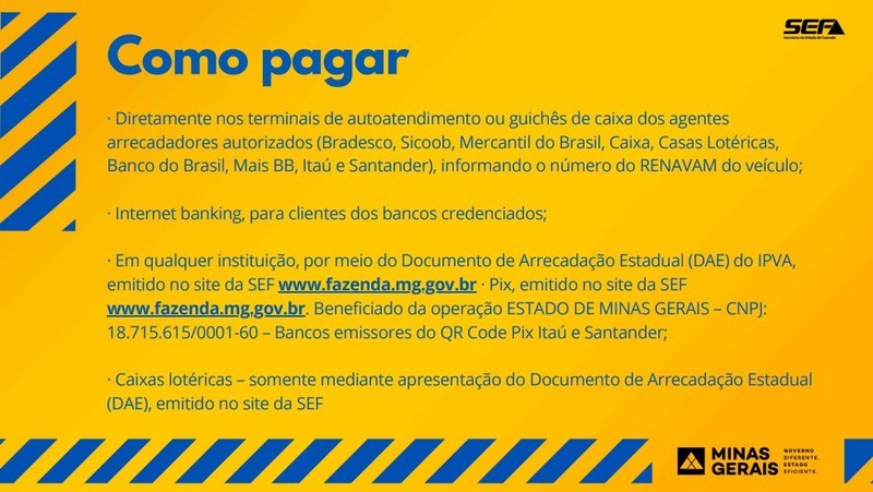 “O sistema não disponibiliza mais a opção de cota única. O proprietário do veículo que quiser pagar a totalidade do imposto, por exemplo, poderá emitir guia única com as três parcelas consolidadas, ou pagar a próxima a vencer junto com a parcela atrasada, bastando fazer a seleção na consulta disponível no site www.fazenda.mg.mgov.br. Lembrando que o pagamento pode ser feito também por Pix. Para o pagamento de parcela isolada, não há diferença em relação ao período de vigência da escala de vencimentos”, explica.