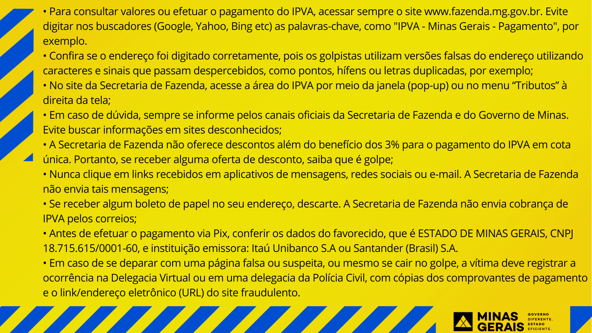 “Para os cidadãos, a principal orientação é não acessar sites que não sejam os oficiais dos órgãos de governo nem clicar em links recebidos por aplicativos de mensagens ou e-mail. Para efetuar o pagamento, preferencialmente digitar www.fazenda.mg.gov.br”, disse o subsecretário da Receita Estadual, Osvaldo Scavazza.