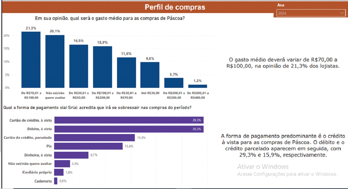 O valor médio a ser gasto no período é de R$ 89,90, segundo os empresários impactados pela data e responderam o intervalo médio que esperam vender no período por consumidor. Já o período de Páscoa do último ano mostrou que o valor médio esperado de venda foi de R$ 76,60 reais. Vale destacar que em torno de 20% dos empresários impactados pela data, em ambos os anos analisados, não quiseram pontuar o valor médio esperado de venda por consumidor.
