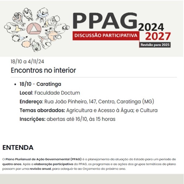 O passo seguinte da revisão do PPAG será a fase de interiorização, em cinco cidades: Caratinga (Vale do Rio Doce), Itaobim e Itamarandiba (Jequitinhonha/Mucuri), Montes Claros (Norte de Minas) e Varginha (Sul de Minas). No caso de Caratinga, a reunião acontece nesta sexta-feira (18), nas dependências da Rede de Ensino Doctum.