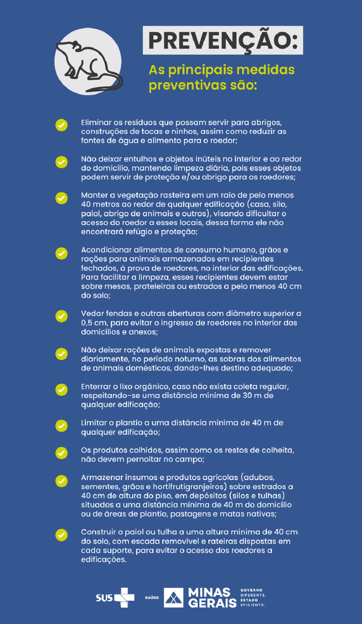 A referência técnica da Vigilância das Hantaviroses da Secretaria de Estado de Saúde de Minas Gerais (SES-MG), Andréia Roberto Santos, explica que o combate à doença exige medidas preventivas de higiene, principalmente, nas áreas rurais. Segundo a técnica, os roedores costumam procurar por alimento e abrigo em locais utilizados para armazenamento de grãos. “Não existe vacina contra a hantavirose. Até o momento, a prevenção baseia-se em medidas que impedem a interação entre o homem e roedores silvestres, nos locais onde é conhecida a presença desses animais”, disse