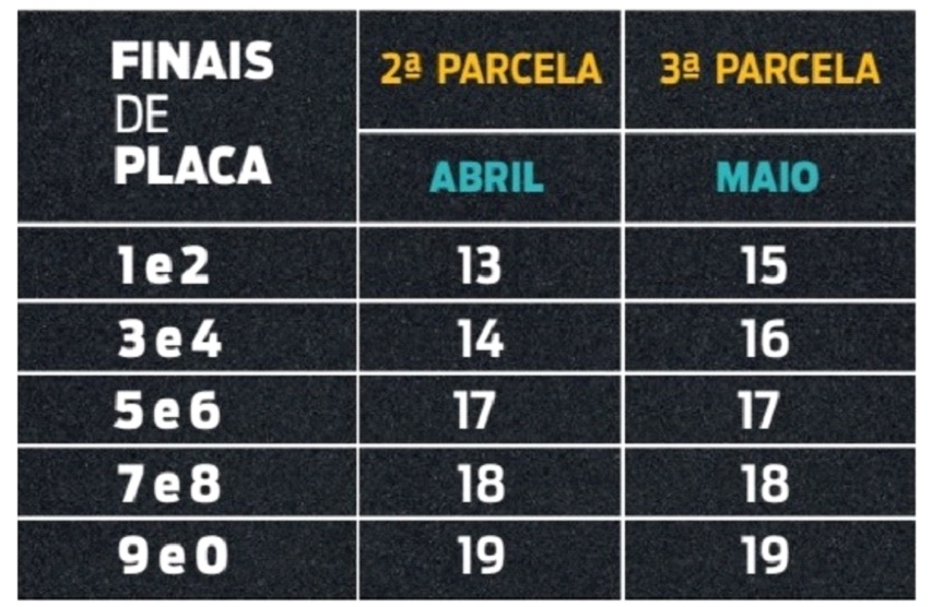 DA REDAÇÃO – A segunda parcela do Imposto sobre a Propriedade de Veículos Automotores (IPVA) de 2023 deve ser paga a partir desta quinta-feira (13), em Minas Gerais. A escala de vencimentos, que tem início com os finais de placa 1 e 2, vai até a quarta-feira (19/4) da próxima semana, se encerrando pelos finais de placa 9 e 0.