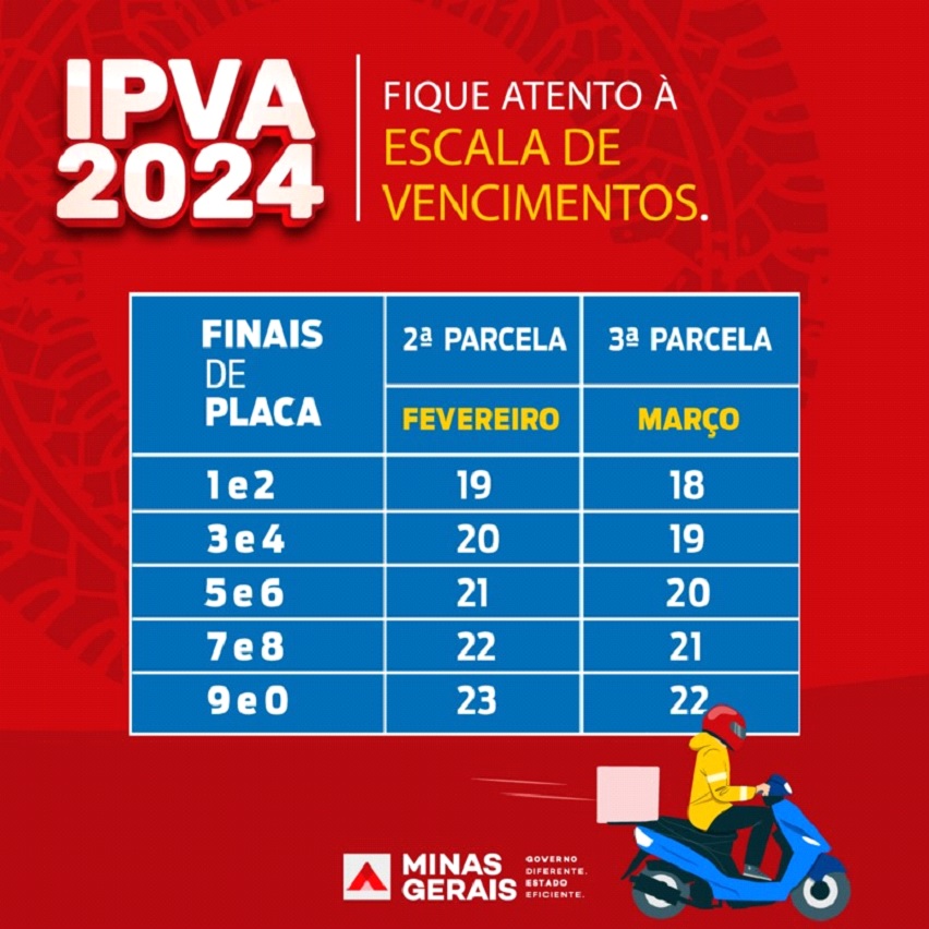 DA REDAÇÃO – Para os proprietários que optaram pelo pagamento parcelado do IPVA 2024, a segunda parcela do imposto deve ser paga na próxima semana, em Minas Gerais. A escala de vencimento começa na segunda-feira (19/2), pelos finais de placa 1 e 2, e se encerra na sexta-feira (23/2), pelos finais 9 e 0.