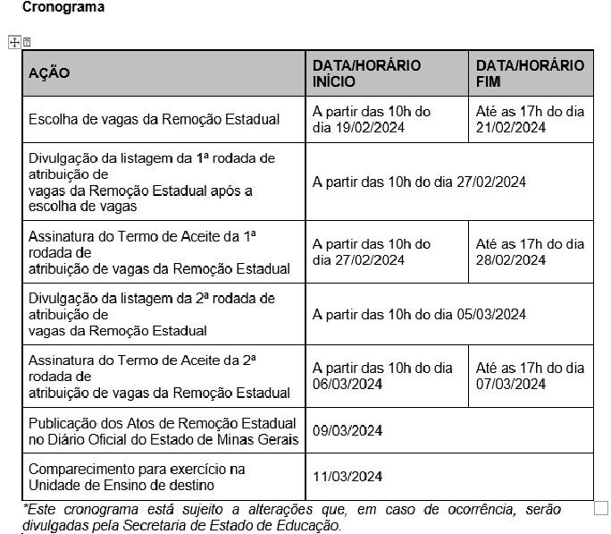 DA REDAÇÃO – Os servidores efetivos do Quadro do Magistério da rede estadual de ensino que demonstraram interesse na remoção estadual devem ficar atentos. O período para a escolha das vagas terá início no dia 19 e vai até o dia 21 de fevereiro neste site. O cronograma da remoção estadual foi anunciado nesta segunda-feira (5/2), pelo secretário de Estado de Educação de Minas, Igor de Alvarenga, acompanhado da secretária adjunta, Geniana Guimarães Faria, e do superintendente de Gestão de Pessoas e Normas, Tarcísio de Castro Monteiro.