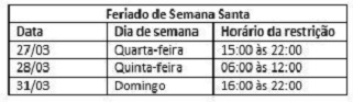 As restrições acontecerão nos seguintes dias e horários: quarta-feira (27/3), das 15 às 22h; na quinta-feira (28/3), entre 6h e 12h, e no domingo (31/3), das 16h às 22h.