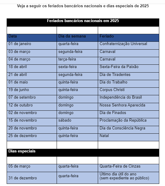 DA REDAÇÃO – O ano de 2025 terá 13 feriados nacionais em que não haverá expediente bancário. Quatro serão no sábado ou domingo, quando já não há atendimento presencial ao público nas agências.