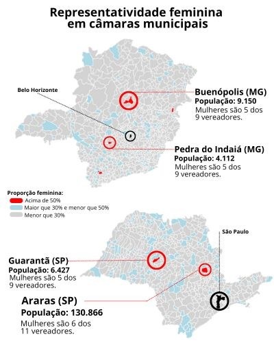 Somente um desse universo de 45 municípios tem mais de 100 mil habitantes. Em Araras (SP), seis das onze cadeiras da Câmara de Vereadores são ocupadas por mulheres. É um ponto fora da curva, já que o grupo de cidades tem uma mediana de população residente de 7.445 pessoas. População mediana é aquela que separa a metade mais populosa da metade menos populosa do conjunto de cidades observadas.