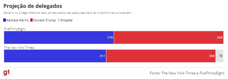 Veja a seguir a projeção de delegados e as médias de pesquisas de acordo com o jornal “The New York Times” e o projeto “FiveThirtyEight”.