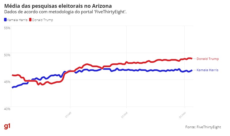 Neste ano, são considerados estados-chave Arizona, Carolina do Norte, Geórgia, Michigan, Nevada, Pensilvânia e Wisconsin. Veja abaixo como está a disputa em cada um deles.