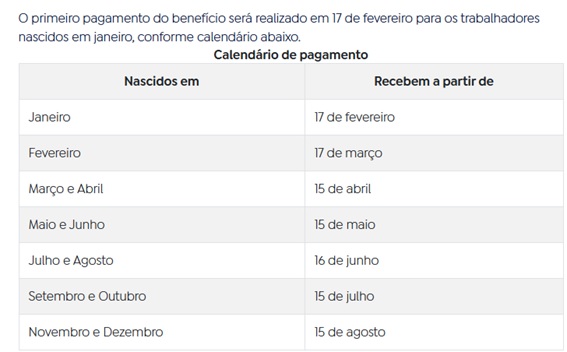O crédito será feito de forma escalonada, de acordo com o mês de nascimento dos trabalhadores. Os que têm conta corrente ou poupança na Caixa receberão direto em sua conta. No Banco do Brasil, o pagamento do benefício será realizado, prioritariamente, por crédito em conta bancária, por meio de PIX, transferência via TED ou, ainda, de forma presencial nas agências de atendimento.