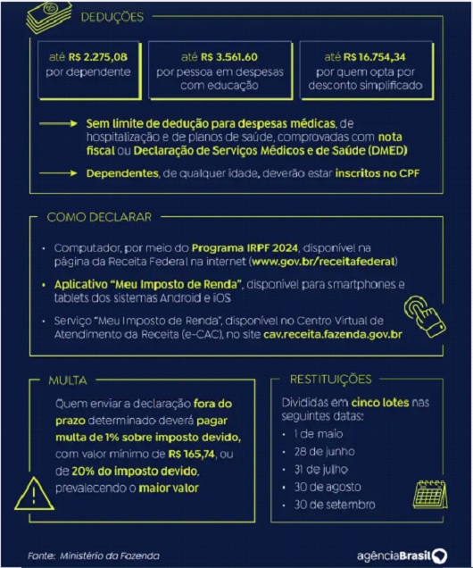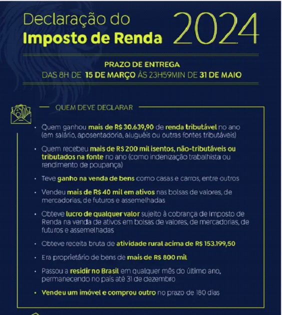 Em 2024, está obrigado a entregar a declaração quem, no ano anterior, recebeu rendimentos tributáveis (salários, aposentadoria, aluguéis), entre 1º janeiro e 31 de dezembro, acima de R$ 30.639,90; ou recebeu rendimentos isentos, não tributáveis ou tributados exclusivamente na fonte acima de R$ 200 mil, como Fundo de Garantia do Tempo de Serviço (FGTS), indenização trabalhista e pensão alimentícia.
