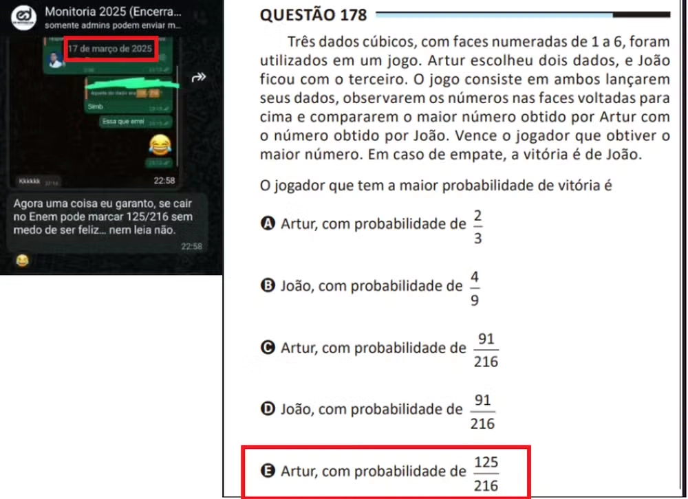 A resposta correta, segundo o gabarito oficial do Inep, era a alternativa “E”: “Artur, com possibilidade de 125/216”.