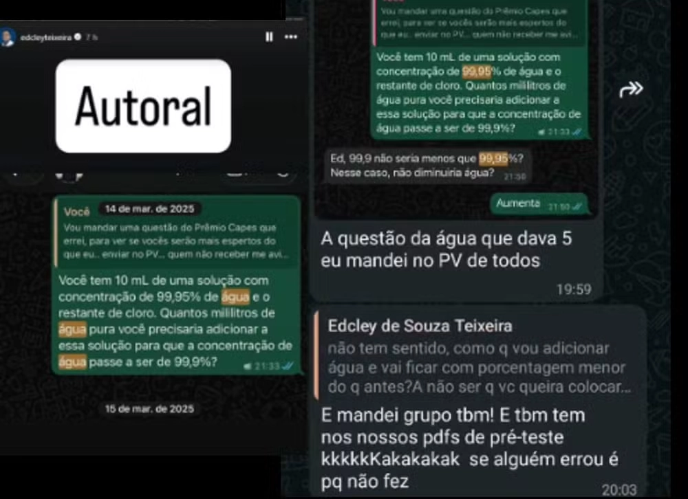 Edcley Teixeira, estudante de medicina que divulgou em uma live do Youtube, cinco dias antes do Enem 2025, questões quase idênticas às da prova oficial, indicou em um grupo de Whatsapp as respostas corretas de outras duas perguntas de matemática, com uma antecedência ainda maior: em março deste ano, a 8 meses da prova oficial. Veja os detalhes mais abaixo.