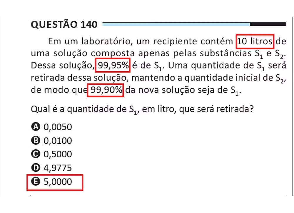 “Em um laboratório, um recipiente contém 10 litros de uma solução composta apenas pelas substâncias S1 e S2. Dessa solução, 99,95% é de S1. Uma quantidade de S1 será retirada dessa solução, mantendo a quantidade inicial de S2, de modo que 99,90% da nova solução seja de S1. Qual é a quantidade de S1, em litro, que será retirada?”. Resposta? Alternativa “e”: 5.