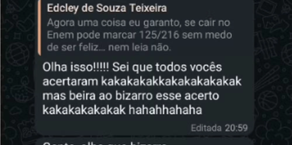 Em 17 de março de 2025, Edcley enviou a seguinte mensagem a um grupo com centenas de alunos que haviam contratado seus serviços de monitoria: “Uma coisa eu garanto: se cair no Enem, pode marcar ‘125/216’ sem medo de ser feliz… Nem leia, não”.