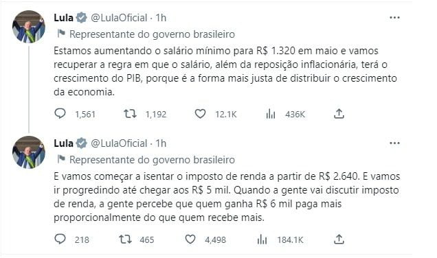Também pelas redes sociais, Lula confirmou o reajuste da tabela do imposto (IR) de renda. Segundo o presidente, a faixa de isenção passará de R$ 1.903,98 para R$ 2.640 e progredirá até chegar a R$ 5 mil.