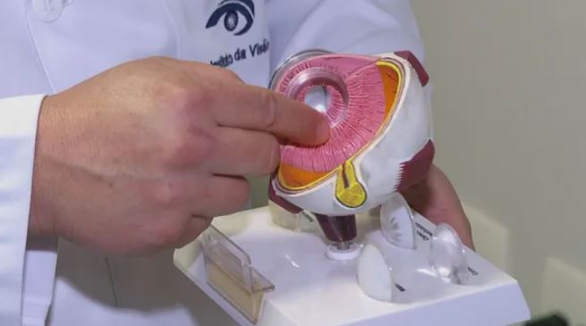 “Quando ela [lente natural] começa a perder a transparência, é dado o nome de catarata. Na cirurgia, você tem que fazer uma incisão para acessar a estrutura intraocular. Ela consiste basicamente em remover o cristalino, que está opaco, e a gente implantar uma lente transparente artificial no lugar do cristalino”, explica.