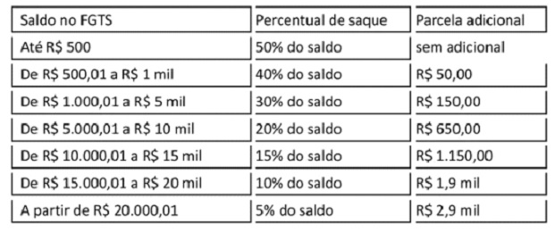 O valor a que o trabalhador que aderiu ao saque-aniversário tem direito a retirar a cada ano depende do saldo em cada conta do FGTS. Para contas com saldo de até R$ 500, poderão ser retirados 50% do total. A partir daí,o percentual cai, mas será pago um valor fixo adicional, que aumenta conforme o saldo total. O cálculo ocorre da seguinte forma: