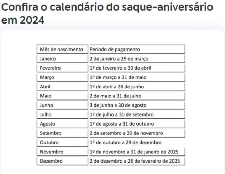 DA REDAÇÃO – Os trabalhadores que optarem pelo saque-aniversário do Fundo de Garantia do Tempo de Serviço (FGTS) aos poucos começam a ter acesso à cota de 2024. As retiradas ocorrem conforme o mês de aniversário do trabalhador. Os cotistas nascidos em janeiro já podem fazer o saque desde a terça-feira (2).