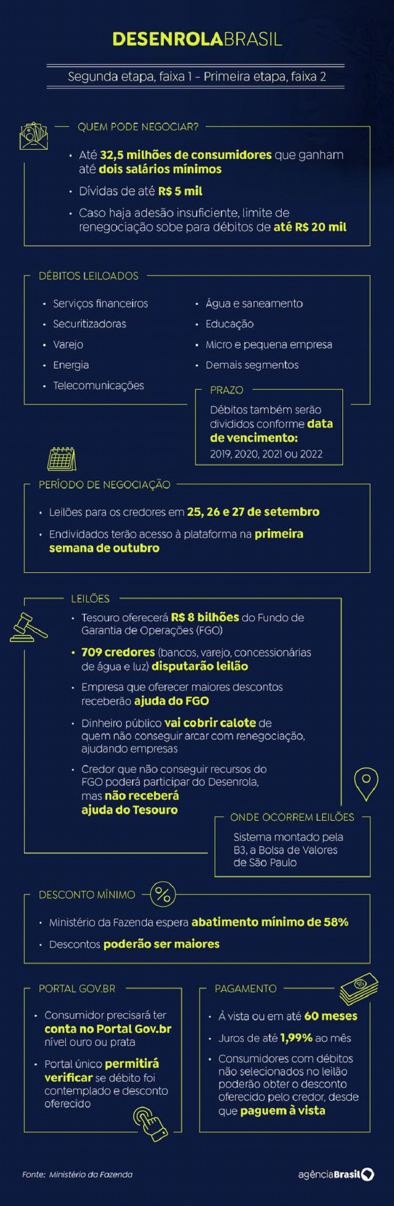 Destinada à Faixa 1 do programa, a segunda etapa do Desenrola pretende beneficiar até 32,5 milhões de consumidores com o nome negativado que ganham até dois salários mínimos. Em tese, só poderão ser renegociadas dívidas de até R$ 5 mil, que representam 98% dos contratos na plataforma e somam R$ 78,9 bilhões. No entanto, caso não haja adesão suficiente, o limite de débitos individuais sobe para R$ 20 mil, que somam R$ 161,3 bilhões em valores cadastrados pelos credores na plataforma.