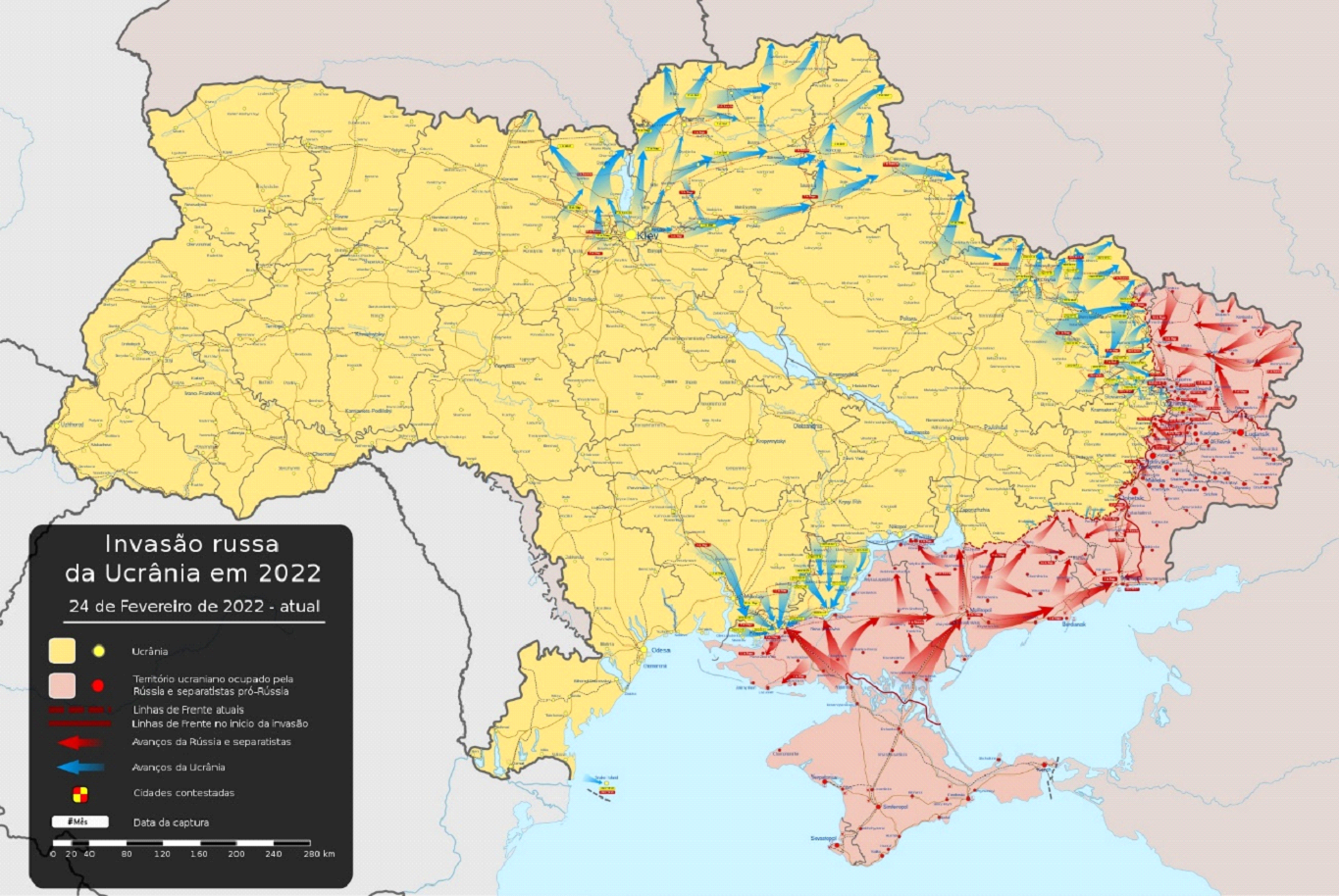 Até o momento, pode-se identificar três fases da guerra: na primeira, de fevereiro a abril de 2022, a Rússia invadiu o Donbass e estendeu os ataques até Kiev; na segunda, de abril a julho, as operações militares russas se concentraram no leste, para controlar os portos de Mariupol e Odessa; na terceira, desde julho, a Ucrânia tem feito uma contraofensiva, com suporte material da Otan, onde se destaca a resistência ucraniana em Kharkiv. Para avaliar o êxito russo, é preciso considerar as metas de Putin com a guerra. A intenção da Rússia é assegurar o controle do leste da Ucrânia e não derrubar o governo Zelensky. Nesse sentido, a guerra convencional colocada em prática por Putin, com uso do efetivo das forças armadas, tem conseguido manter a presença russa no Donbass. A possibilidade da Ucrânia retomar a região é mínima. Putin, assim, pressiona o governo Zelensky a ceder aos pedidos russos, que são: reconhecer a perda dos territórios ocupados, não fazer parte da União Europeia e da Otan. Trata-se de uma estratégia de longo prazo, apostando no desgaste que um conflito prolongado pode provocar na sociedade civil ucraniana e na demanda pelo fim das hostilidades que essa situação pode provocar. Observando a guerra por essa ótica, a Rússia não está usando todo o potencial bélico, e sim, o necessário para controlar o leste.