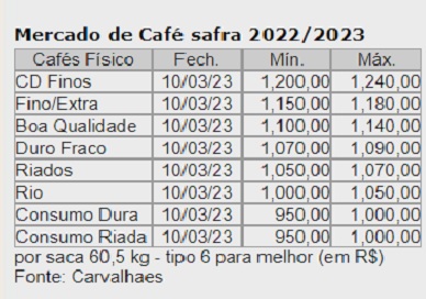 Em reais por saca, os contratos para maio próximo na ICE em Nova Iorque fecharam sexta-feira (10) valendo R$ 1 224,89. Quinta-feira (9) terminaram o dia a R$ 1 190,43. Na sexta-feira anterior, 3/3, encerraram a semana a R$ 1 223,35.