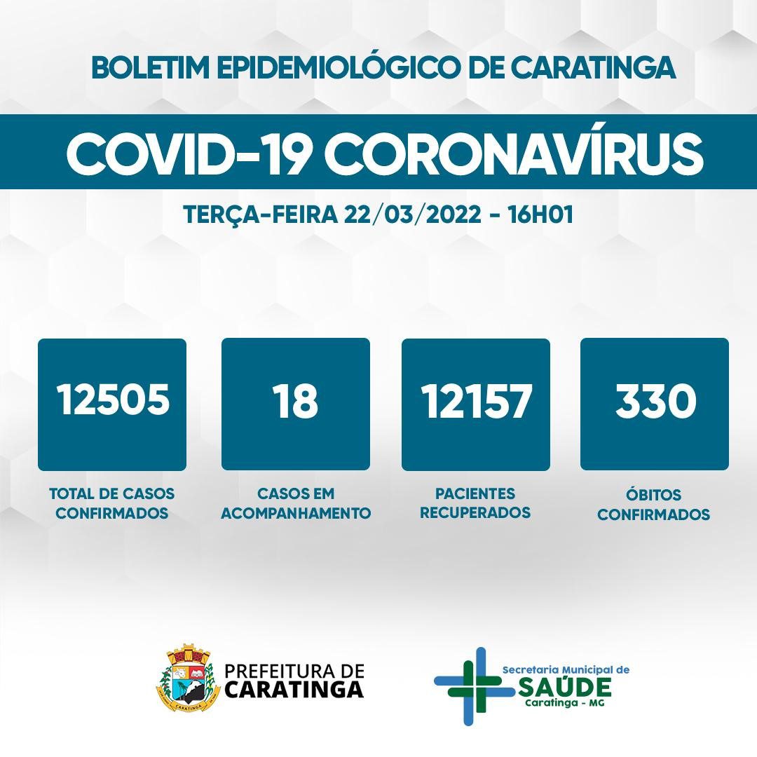 CARATINGA – Apenas um caso de covid-19 foi registrado em Caratinga nas últimas 24 horas. Isso é o que mostrou o boletim epidemiológico emitido na tarde dessa terça-feira (22) pela Secretaria Municipal de Saúde. Agora são 12.505 casos confirmados. No boletim anterior esse número era de 12.504.