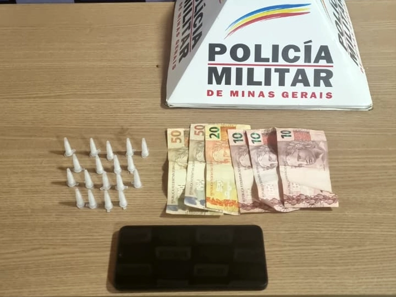Durante a abordagem e as buscas, os policiais localizaram um invólucro contendo recipientes com substância semelhante à cocaína, além de dinheiro e um telefone celular, que também foram apreendidos.