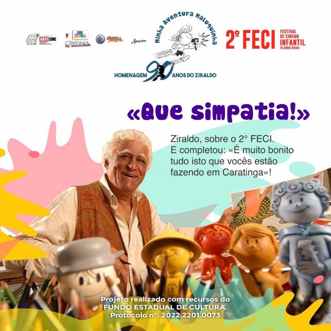 DA REDAÇÃO – “Que simpatia!” É assim que Ziraldo tem reagido sempre que vê algo que lhe agrada muito. Da mesma forma, pode ser um “Que antipatia”! Ele deu um entusiasmado “Que simpatia!” para o 2° FECI – Festival de Cinema de Minas Gerais, que está acontecendo e terá sua final no dia 24 de outubro, no Cine Itaúna, bem no dia do seu aniversário de 90 anos.