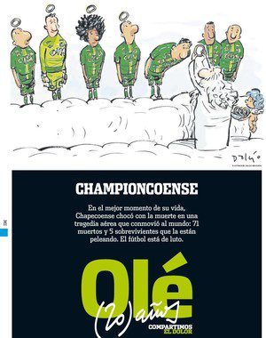 O acidente com o time da Chapecoense deixou o mundo consternado. 71 pessoas morreram após a queda do avião que levava a delegação, jornalistas e convidados. E uma das mais belas homenagens foi feita pelo principal jornal de esportes da Argentina, o diário “Olé”. “Championcoense” foi o trocadilho escolhido pelos jornalistas para a manchete principal do periódico, que traz ainda uma charge que viralizou nas redes sociais, dos jogadores da equipe sendo “premiados” com auréolas no céu.