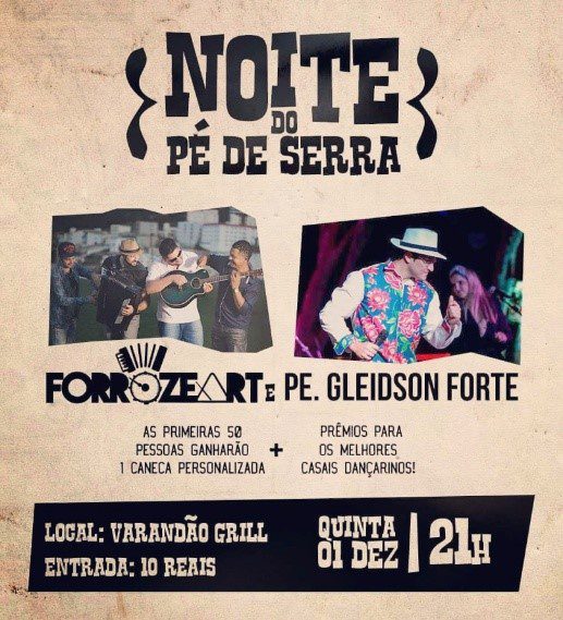 Acontece hoje a “Noite do Pé de Serra”, com Forrozeart e padre Gleidson no Varandão Grill. Padre Gleidson deixa o convite: “Vamos forrozear? A noite mais animada de Caratinga! Chama a família e os amigos para se alegrar, cantar e até arriscar uns passinhos ao som da melhor música nordestina. Xote, xaxado e baião. Forró no pé e no coração. Venha se divertir numa noite de alegria e emoção”. Quem ainda não adquiriu o ingresso; vendas estão disponíveis com Luciano Fera, Extra Farma, padre Gleidson e Varandão.