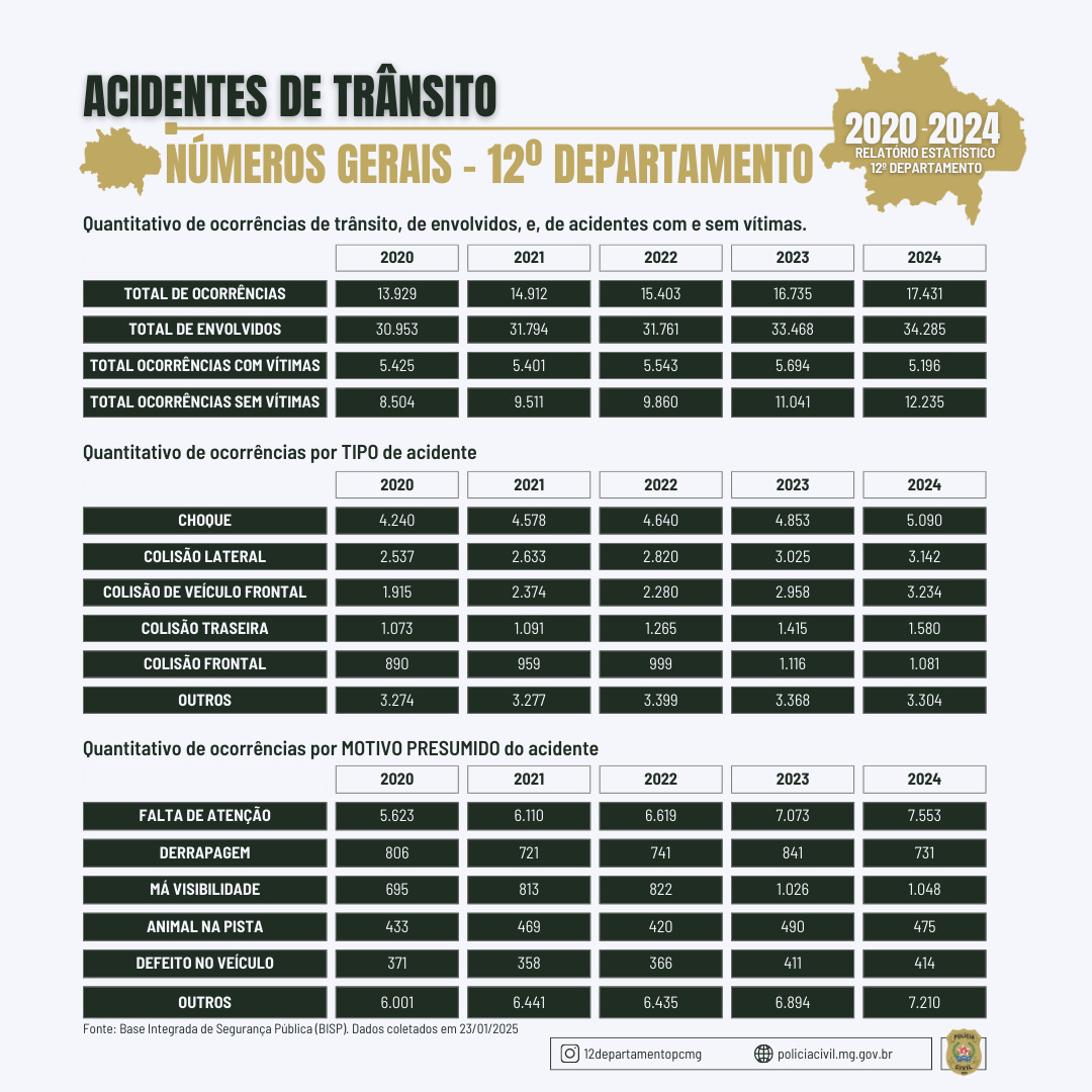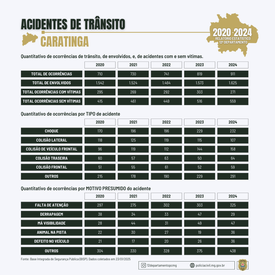 Melhor controle sobre fatores como derrapagens e má visibilidade: O número de acidentes causados por derrapagem permanece estável (91 em 2024), o que pode refletir investimentos em pavimentação ou maior cuidado dos motoristas. Já os casos de má visibilidade diminuíram, passando de 201 em 2023 para 159 em 2024, o que sugere avanços nas condições de sinalização e iluminação. O número de acidentes nas regionais de Caratinga, Itabira, João Monlevade e Ponte Nova diminuiu quando comparados os anos de 2024 e 2023. Os números são otimistas, visto que havia um aumento crescente nos índices de 2020, 2021, 2022 e 2023, apresentando queda em 2.204. A falta de atenção foi uma das principais causas, enquanto o choque foi o tipo principal de acidente.