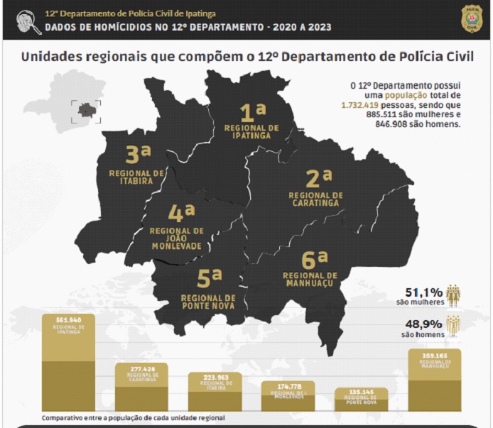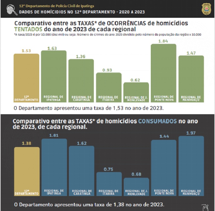 Segundo o delegado-geral Gilmaro Alves Ferreira, é importante apresentar também as taxas pelas áreas das regionais, visto que uma regional com maior população pode apresentar números absolutos maiores, como é o caso da maior regional (Ipatinga), com 561.940 habitantes, e a menor, Ponte Nova, com 135.145 habitantes. No contexto das taxas, para cada grupo de 10.000 habitantes, Ponte Nova apresentou em 2023 a maior taxa, com 1,84, enquanto Ipatinga apresentou uma taxa de 1,63 para os homicídios tentados. Já para os consumados, a maior taxa foi de Manhuaçu, com 1,97, enquanto a menor taxa foi de João Monlevade, com 0,68. A regional de Ipatinga apresentou uma taxa de 1,81.