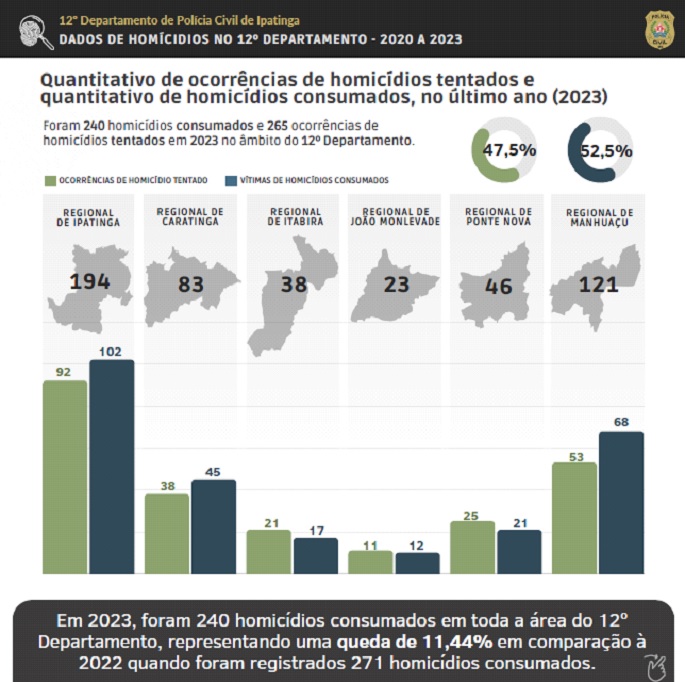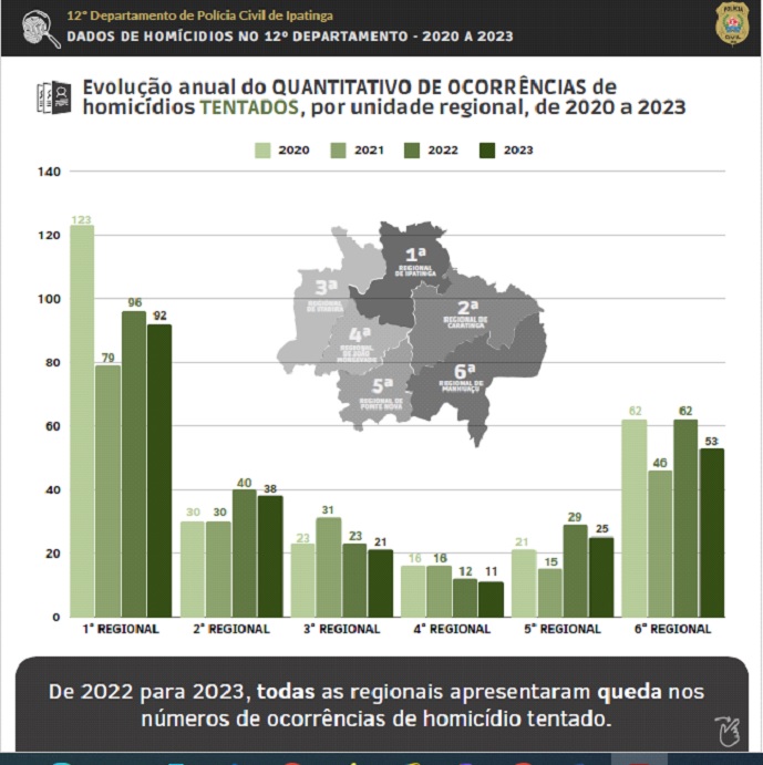 Em 2023, analisando os homicídios consumados, as regionais de Ipatinga e Caratinga apresentaram acréscimos
