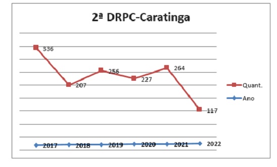Em Ipatinga, durante os seis anos analisados, os números oscilaram da seguinte forma: 508 ocorrências em 2017, 608 em 2018, 559 em 2019, 607 em 2020, 579 em 2021 e 453 em 2022. O estudo também revela que a maior queda de índices de tráfico de drogas entre as Delegacias Regionais do 12º Departamento de Polícia Civil ocorreu em Caratinga, com 56% de redução no período de 2021 a 2022. Conforme dados, em 2017 foram 336 ocorrências, 207 em 2018, 256 em 2019, 227 em 2020, 264 em 2021 e 117 em 2022. No entanto, a Delegacia Regional de Manhuaçu foi a única a apresentar um pequeno aumento nas ocorrências desse tipo penal, com um aumento de 6% no comparativo entre os anos de 2021 e 2022.